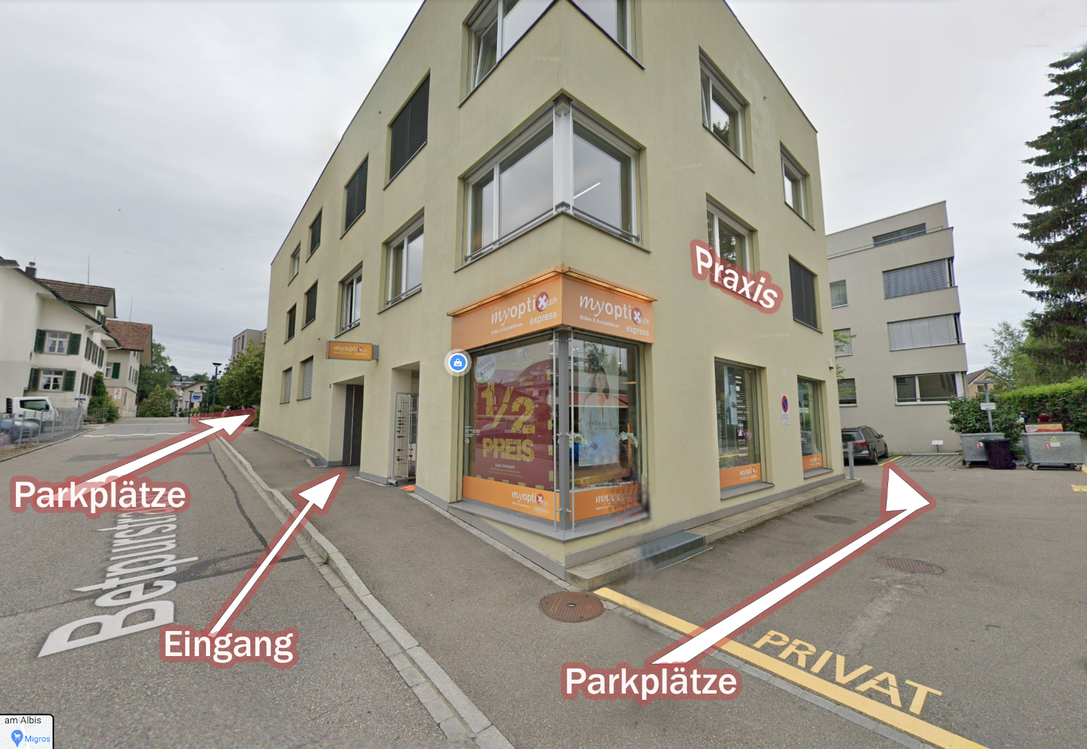Für Patienten*innen, die mit dem Auto kommen, stehen rund ums Gebäude insgesamt 7 Besucherparkplätze zur Verfügung (beschriftet mit dem Namen der Liegenschaften Betpurstrasse 7-9). Sollten ausnahmsweise alle besetzt sein, gibt es in der Umgebung weitere Parkmöglichkeiten (Migros, Obere Bahnhofstrasse etc.) in Gehdistanz.